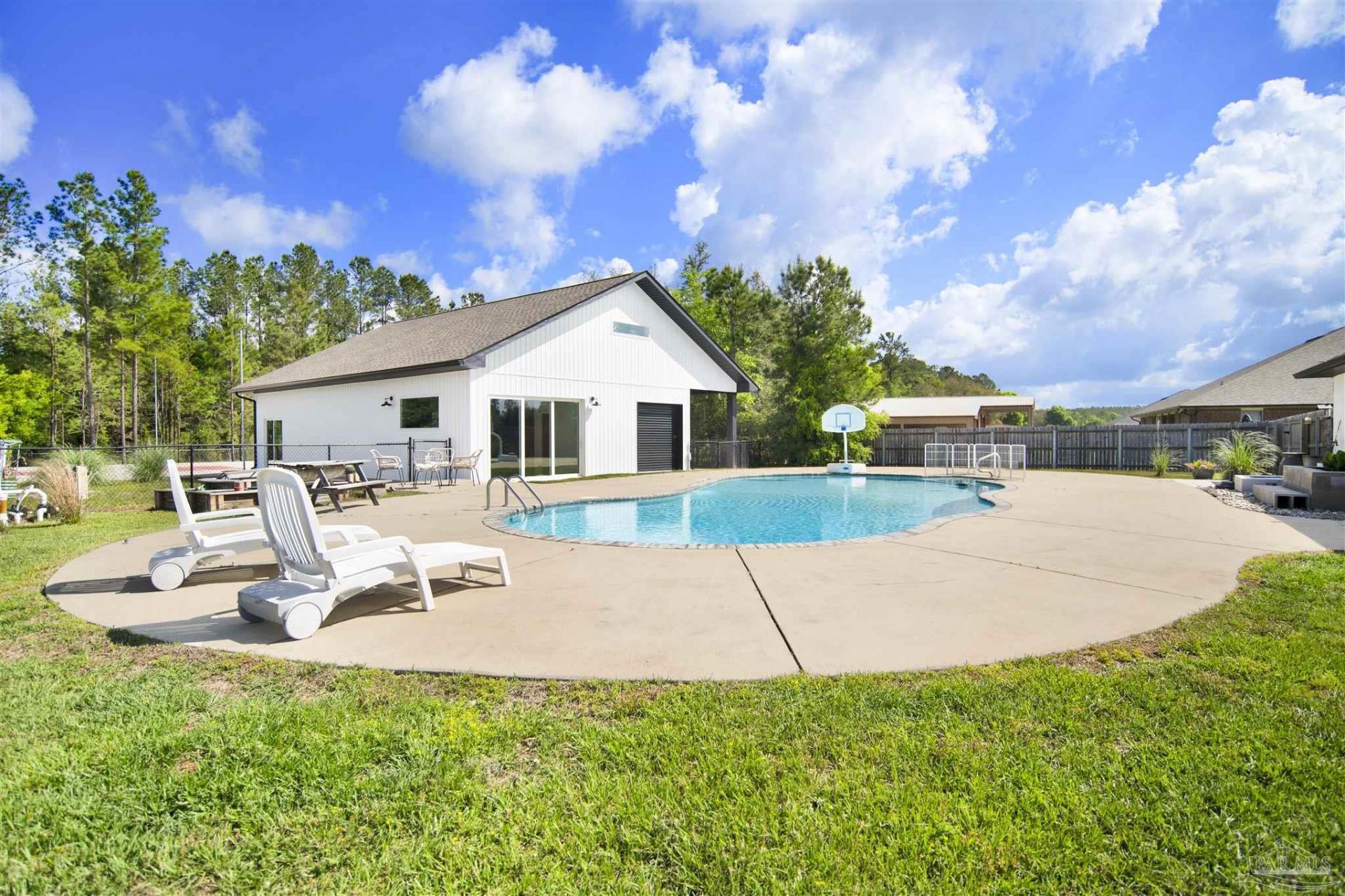 MAIN HOME: 2,709 SF | 4 Bedrooms + Office + 3 Bathrooms. DETACHED GUEST QUARTERS & GYM: 1,800 SF | 1 Bedroom + 1 Bathroom + Full Kitchen & 40 Carport-RV hookup. Total footprint: 4,509 SF under roof on a full acre. Two buildings. One extraordinary property. The main home delivers 2,709 SF of all-brick living with a split floor plan, cathedral ceilings, and abundant natural light throughout. The open-concept kitchen, dining, and living areas flow seamlessly to the backyard and inground pool. The remodeled kitchen features new cabinetry, stainless appliances, pot filler, solid surface countertops, a large island, and boxed ceilings. A cathedral-ceiling media room with projector and screen adds serious wow factor. The primary suite includes hardwood flooring, a trey ceiling, French doors to a screened porch, and an ensuite with garden tub, separate shower, walk-in closet, and water closet. A private mother-in-law suite also opens to the porch. Two additional bedrooms, a dedicated office, and a butler's pantry and laundry room with EV-charging garage access round out the main home. The detached structure is a game-changer: 1,800 SF housing a fully equipped gym and guest quarters with a full kitchen, 1 bedroom, 1 bathroom, tile floors, and private entry - ideal for multigenerational living, a home business, or income potential. Outside: inground pool, regulation pickleball and basketball court, and a dedicated well for irrigation and the detached building. Recent updates include roof 2021, HVAC with ductwork 2023, on-demand water heater 2026, pool liner, 2023, vinyl windows 2022, interior doors, flooring, lighting etc. Space. Style. Substance. This one is the real deal.
